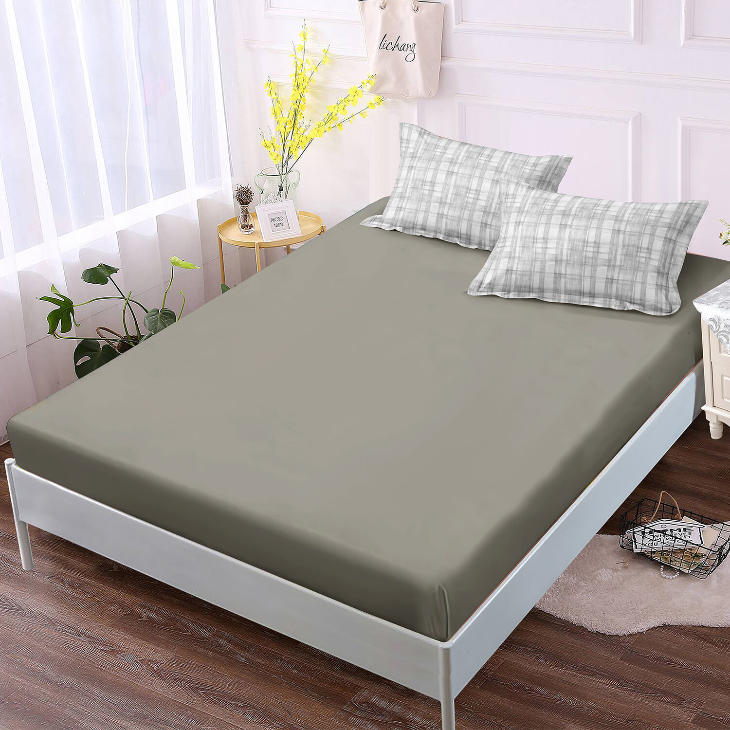 Fitted Sheet x 1: Elastic straps on the corners to cover the mattresses neatly around the corner.