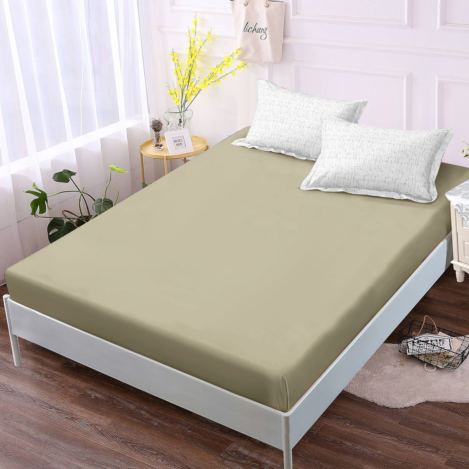 Fitted Sheet x 1: Elastic straps on the corners to cover the mattresses neatly around the corner.